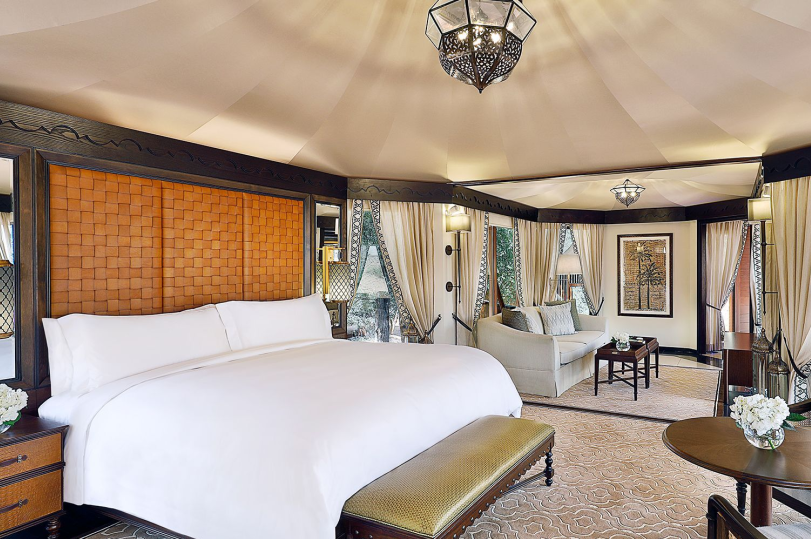 酒店設(shè)計(jì)將傳統(tǒng)貝都因游牧民居風(fēng)格的帳篷屋頂與經(jīng)典阿拉伯風(fēng)格的別墅家具進(jìn)行了現(xiàn)代詮釋?zhuān)燃俅鍩o(wú)縫地融入沙漠環(huán)境。