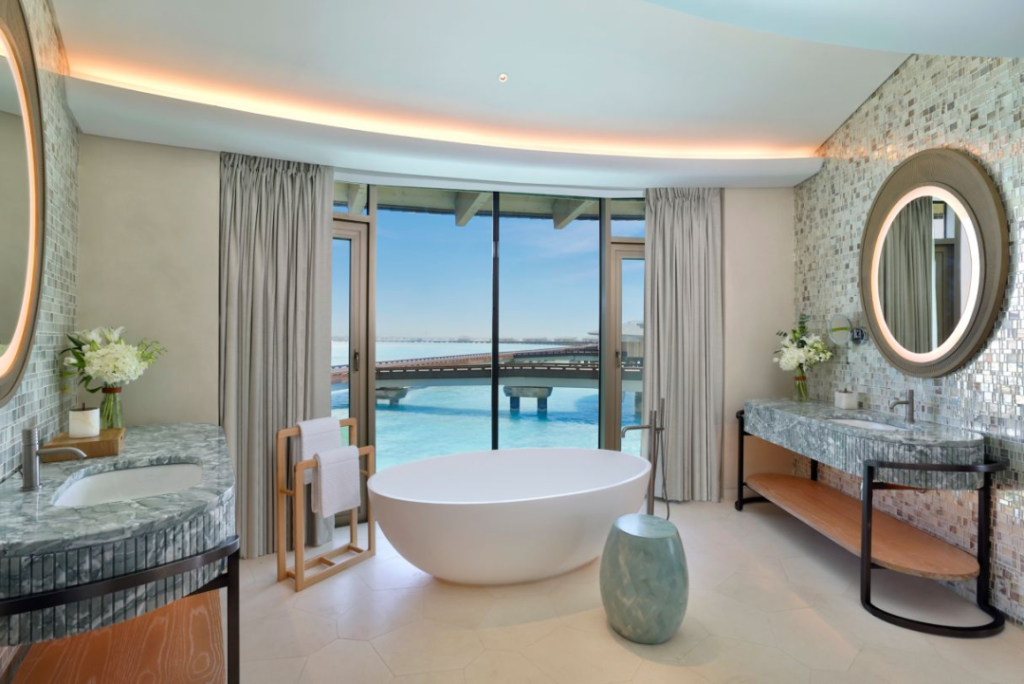 所有的獨(dú)棟別墅都配有私人游泳池和落地窗,阿拉伯灣的水域、奇幻沙漠景觀、壯麗的山脈一覽無(wú)遺,營(yíng)造出一種超現(xiàn)實(shí)的沙漠浪漫氛圍。